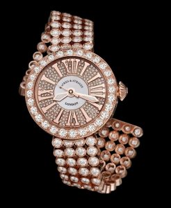 This is a 18K 37mm rose gold case and bracelet set Hearts and Arrows, Ideal Cut diamonds and faceted to perfect proportions for a total diamond weight of 23.36cts. Each link in the bracelet is hand made and is set with 136 Hearts and Arrows, Ideal cut diamonds, and the bezel is set with 28 diamonds as well. It features a Mother of Pearl dial surrounded by 162 Hearts and Arrows diamond, an automatic movement, sapphire crystal, and solid rose gold case back.