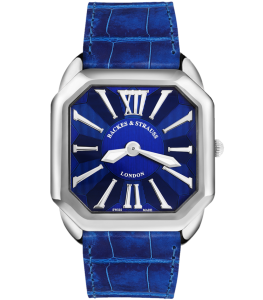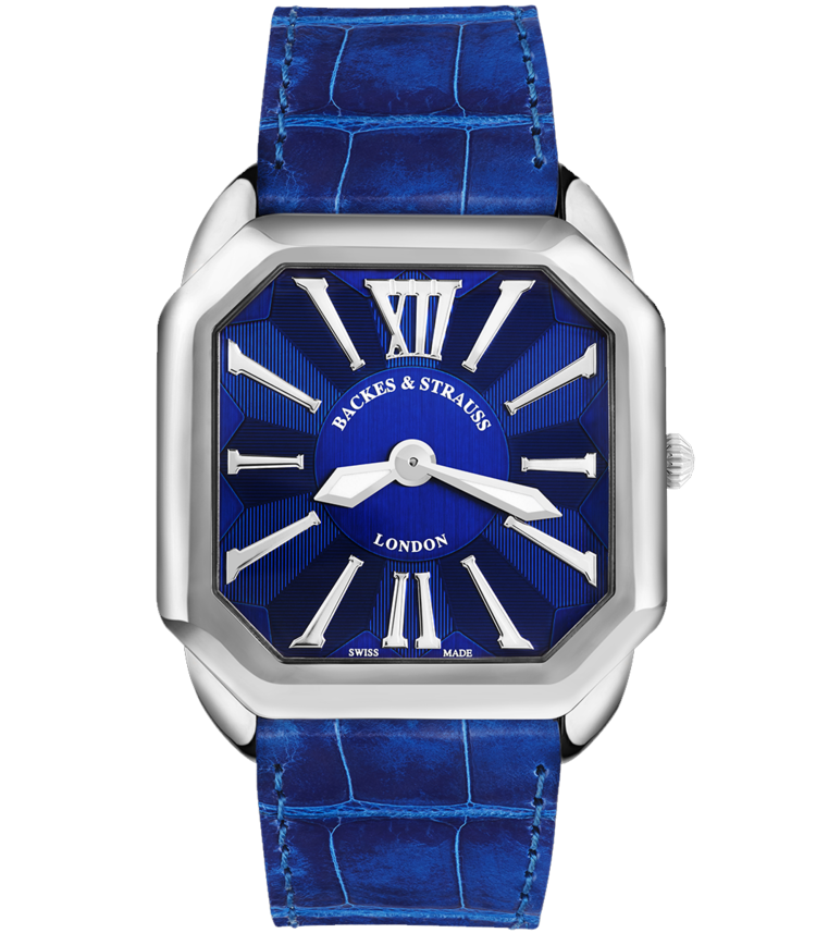 This is a polished 40mm stainless steel, with a gorgeous blue dial with applied hour markers, an extra thin hand engraved mechanical hand wind movement made specially for Backes & Strauss by Franck Muller atelier. The crown features the Backes & Strauss signature “Jewel in the Crown” diamond, this references the hand set diamond in the crown of the watch. This stunning piece has a glass exhibition case back, and comes on a royal blue color strap with a traditional pin buckle.