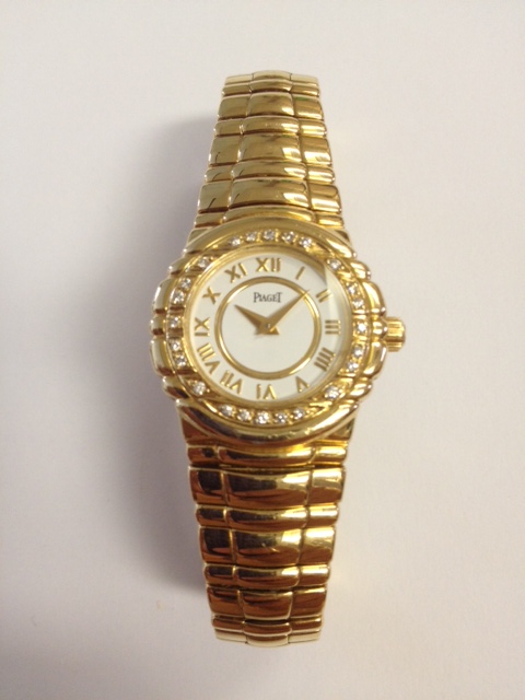 Piaget Lady with factory diamond bezel, pre-owned IN LIKE NEW CONDITION! It is yellow gold, diamond bezel, white porcelain dial. Retail is $19,800 dlrs.