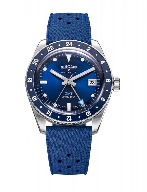 GMT function, 38.8mm stainless steel case, screw down crown, automatic movement, sapphire crystal, date indicator, blue color dial, and exhibition sapphire case back. Shown here on a sporty blue color rubber strap with a traditional pin buckle.