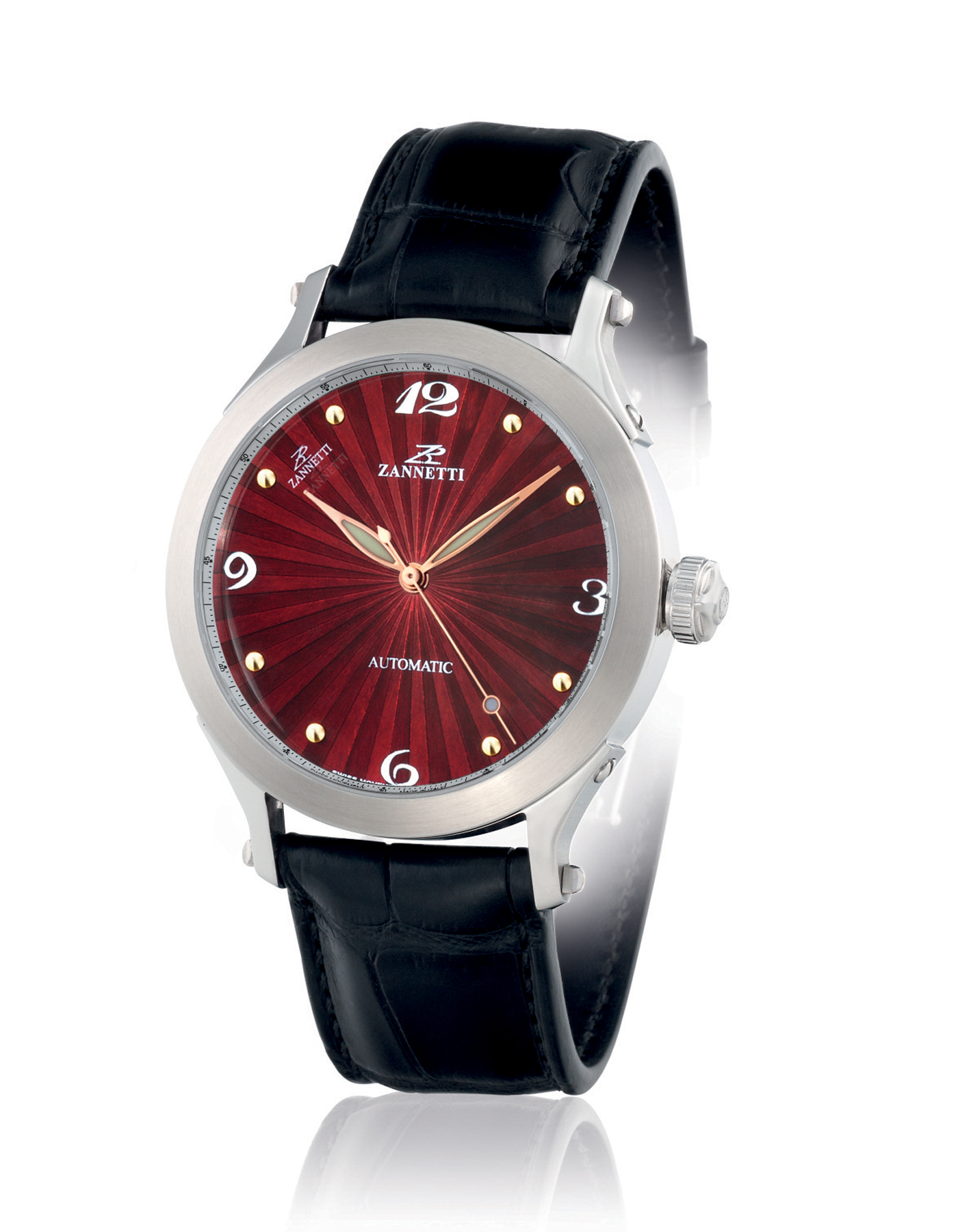 42mm stainless steel case, hand painted sunburst enamel red dial, automatic movement. It features a solid stainless steel case back, and comes on a alligator leather strap, and a stainless steel pin buckle.